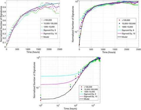 Contemporary collective action, much of which involves social media and other Internet-based platforms, leaves a digital imprint which may be harvested to better understand the dynamics of mobilization. Petition signing is an example of collective action which has gained in popularity with rising use of social media and provides such data for the whole population of petition signatories for a given platform. This paper tracks the growth curves of all 20,000 petitions to the UK government petitions website (http://epetitions.direct.gov.uk) and 1,800 petitions to the US White House site (https://petitions.whitehouse.gov), analyzing the rate of growth and outreach mechanism. Previous research has suggested the importance of the first day to the ultimate success of a petition, but has not examined early growth within that day, made possible here through hourly resolution in the data. The analysis shows that the vast majority of petitions do not achieve any measure of success; over 99 percent fail to get the 10,000 signatures required for an official response and only 0.1 percent attain the 100,000 required for a parliamentary debate (0.7 percent in the US). We analyze the data through a multiplicative process model framework to explain the heterogeneous growth of signatures at the population level. We define and measure an average outreach factor for petitions and show that it decays very fast (reducing to 0.1% after 10 hours in the UK and 30 hours in the US). After a day or two, a petition’s fate is virtually set. The findings challenge conventional analyses of collective action from economics and political science, where the production function has been assumed to follow an S-shaped curve.