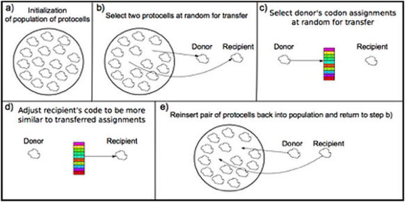 Horizontal transfer of code fragments between protocells can explain the origins of the genetic code without vertical descent