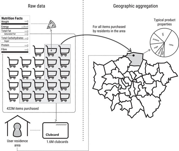 We present the Tesco Grocery 1.0 dataset: a record of 420 M food items purchased by 1.6 M fidelity card owners who shopped at the 411 Tesco stores in Greater London over the course of the entire year of 2015, aggregated at the level of census areas to preserve anonymity. For each area, we report the number of transactions and nutritional properties of the typical food item bought including the average caloric intake and the composition of nutrients. The set of global trade international numbers (barcodes) for each food type is also included. To establish data validity we: i) compare food purchase volumes to population from census to assess representativeness, and ii) match nutrient and energy intake to official statistics of food-related illnesses to appraise the extent to which the dataset is ecologically valid. Given its unprecedented scale and geographic granularity, the data can be used to link food purchases to a number of geographically-salient indicators, which enables studies on health outcomes, cultural aspects, and economic factors.