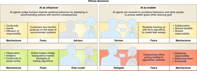 As machines powered by artificial intelligence (AI) influence humans’ behaviour in ways that are both like and unlike the ways humans influence each other, worry emerges about the corrupting power of AI agents. To estimate the empirical validity of these fears, we review the available evidence from behavioural science, human–computer interaction and AI research. We propose four main social roles through which both humans and machines can influence ethical behaviour. These are: role model, advisor, partner and delegate. When AI agents become influencers (role models or advisors), their corrupting power may not exceed the corrupting power of humans (yet). However, AI agents acting as enablers of unethical behaviour (partners or delegates) have many characteristics that may let people reap unethical benefits while feeling good about themselves, a potentially perilous interaction. On the basis of these insights, we outline a research agenda to gain behavioural insights for better AI oversight.