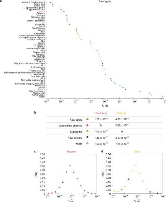 Extensive programmes around the world endeavour to measure and catalogue the composition of food. Here we analyse the nutrient content of the full US food supply and show that the concentration of each nutrient follows a universal single-parameter scaling law that accurately captures the eight orders of magnitude in nutrient content variability. We show that the universality is rooted in the biochemical constraints obeyed by the metabolic pathways responsible for nutrient modulation, allowing us to confirm the empirically observed scaling law and to predict its variability in agreement with the data. We propose that the natural nutrient variability in food can be quantitatively formalized. This provides a mathematical rationale for imputing missing values in food composition databases and paves the way towards a quantitative understanding of the impact of food processing on nutrient balance and health effects.