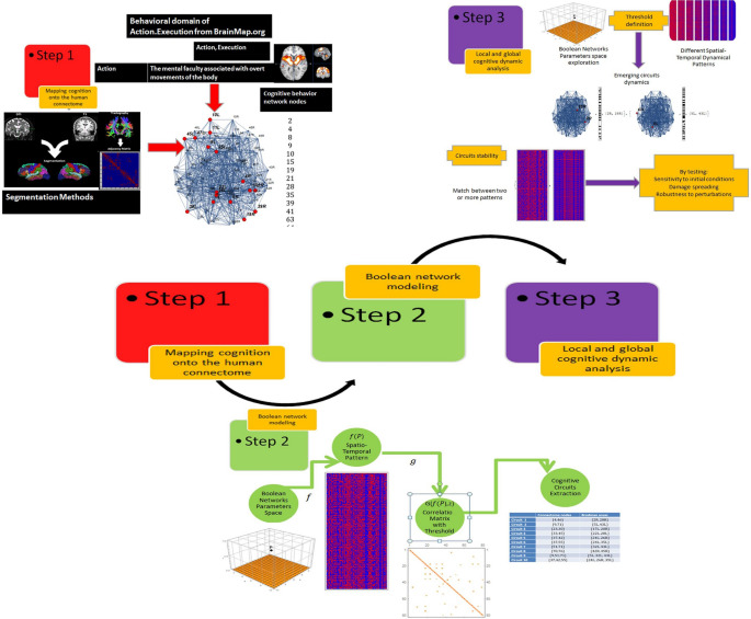Understanding the relationship between brain architecture and brain function is a central issue in neuroscience. We modeled realistic spatio-temporal patterns of brain activity on a human connectome with a Boolean networks model with the aim of computationally replicating certain cognitive functions as they emerge from the standardization of many fMRI studies, identified as patterns of human brain activity. Results from the analysis of simulation data, carried out for different parameters and initial conditions identified many possible paths in the space of parameters of these network models, with normal (ordered asymptotically constant patterns), chaotic (oscillating or disordered) but also highly organized configurations, with countless spatial–temporal patterns. We interpreted these results as routes to chaos, permanence of the systems in regimes of complexity, and ordered stationary behavior, associating these dynamics to cognitive processes. The most important result of this work is the study of emergent neural circuits, i.e., configurations of areas that synchronize over time, both locally and globally, determining the emergence of computational analogues of cognitive processes, which may or may not be similar to the functioning of biological brain. Furthermore, results put in evidence the creation of how the brain creates structures of remote communication. These structures have hierarchical organization, where each level allows for the emergence of brain organizations which behave at the next superior level. Taken together these results allow the interplay of dynamical and topological roots of the multifaceted brain dynamics to be understood.