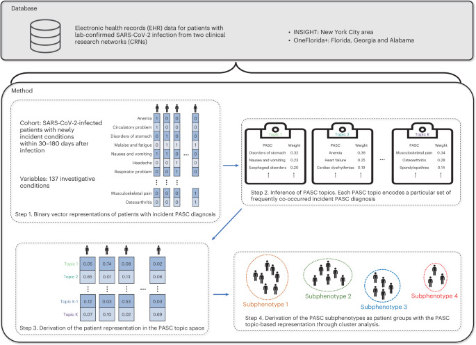 The post-acute sequelae of SARS-CoV-2 infection (PASC) refers to a broad spectrum of symptoms and signs that are persistent, exacerbated or newly incident in the period after acute SARS-CoV-2 infection. Most studies have examined these conditions individually without providing evidence on co-occurring conditions. In this study, we leveraged the electronic health record data of two large cohorts, INSIGHT and OneFlorida+, from the national Patient-Centered Clinical Research Network. We created a development cohort from INSIGHT and a validation cohort from OneFlorida+ including 20,881 and 13,724 patients, respectively, who were SARS-CoV-2 infected, and we investigated their newly incident diagnoses 30–180 days after a documented SARS-CoV-2 infection. Through machine learning analysis of over 137 symptoms and conditions, we identified four reproducible PASC subphenotypes, dominated by cardiac and renal (including 33.75% and 25.43% of the patients in the development and validation cohorts); respiratory, sleep and anxiety (32.75% and 38.48%); musculoskeletal and nervous system (23.37% and 23.35%); and digestive and respiratory system (10.14% and 12.74%) sequelae. These subphenotypes were associated with distinct patient demographics, underlying conditions before SARS-CoV-2 infection and acute infection phase severity. Our study provides insights into the heterogeneity of PASC and may inform stratified decision-making in the management of PASC conditions.