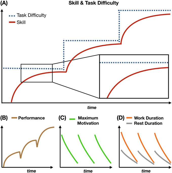 Lifelong learning occurs on timescales ranging from moments to decades. People can lose themselves in a new skill, practice for hours until exhausted, and pursue mastery intermittently over decades. A full understanding of learning requires an account that integrates these timescales. Here, in response to calls for more formal theory in the psychological sciences, we present a parsimonious mathematical model that unifies the nested timescales of learning. Our model recovers well-established patterns of skill acquisition, and explains how these patterns can emerge from short-timescale dynamics of motivation, fatigue, and effort. Conversely, the model explains how patterns in these short-timescale dynamics are shaped by longer-term dynamics of skill selection, mastery, and abandonment. We use this model to explore the theoretical benefits and pitfalls of a variety of training regimes. Our model connects disparate timescales—and the subdisciplines that typically study each timescale in isolation—to offer a unified, multiscale account of skill acquisition.